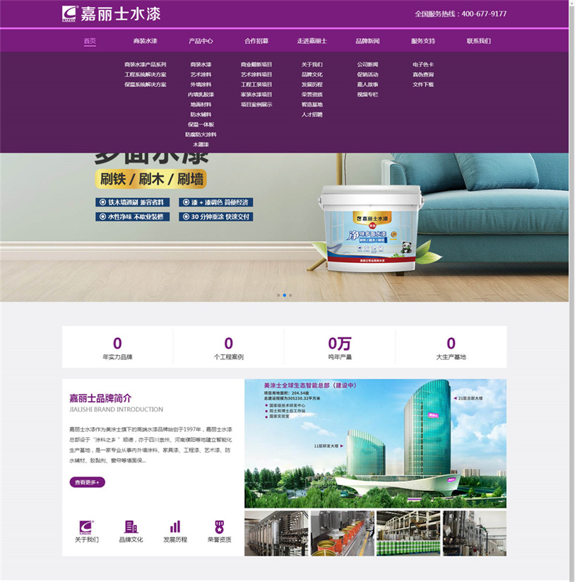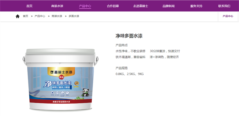 嘉麗士以用戶為中心,以便捷實(shí)用為原則。為了讓用戶擁有更便捷的訪問(wèn)體驗(yàn),新官網(wǎng)對(duì)頂部導(dǎo)航菜單欄重新規(guī)劃了板塊架構(gòu)。在對(duì)各類信息重新歸類整合后,分為八大板塊布局,分別是“首頁(yè)、商裝水漆、產(chǎn)品中心、合作招募、走進(jìn)嘉麗士、品牌新聞、服務(wù)支持、聯(lián)系我們”。導(dǎo)航欄板塊簡(jiǎn)潔清晰,重點(diǎn)頭部欄目一覽無(wú)余,下拉欄目子項(xiàng)的陳列布局,全方位、多層次呈現(xiàn)嘉麗士的各項(xiàng)信息,瀏覽體驗(yàn)更為便捷、明快,使全站信息一觸即達(dá)。