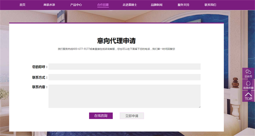 從網(wǎng)頁(yè)頂部導(dǎo)航欄“聯(lián)系我們”到底部增設(shè)的多渠道咨詢服務(wù),用戶可以從400服務(wù)熱線、在線咨詢、留言與我們聯(lián)系,我們將針對(duì)不同用戶的需求,打造專屬方案和服務(wù)。用戶還可通過(guò)手機(jī)掃描網(wǎng)頁(yè)底部的二維碼關(guān)注嘉麗士公眾號(hào),定期獲取嘉麗士最新資訊。此外,新官網(wǎng)還開設(shè)了合作招募通道,面向全國(guó)誠(chéng)招合伙人,攜手共建美好未來(lái)!