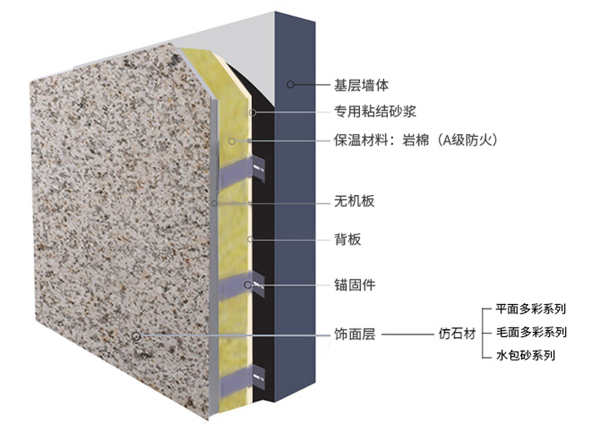 無(wú)機(jī)板類(lèi)多彩仿石保溫裝飾一體板選用高密度、高強(qiáng)度A1級(jí)無(wú)機(jī)板為基材,通過(guò)精砂、滲透封閉、界面處理、飾面噴涂(輥涂)、固化、養(yǎng)護(hù)、復(fù)合等多道現(xiàn)代化生產(chǎn)工序加工成型。