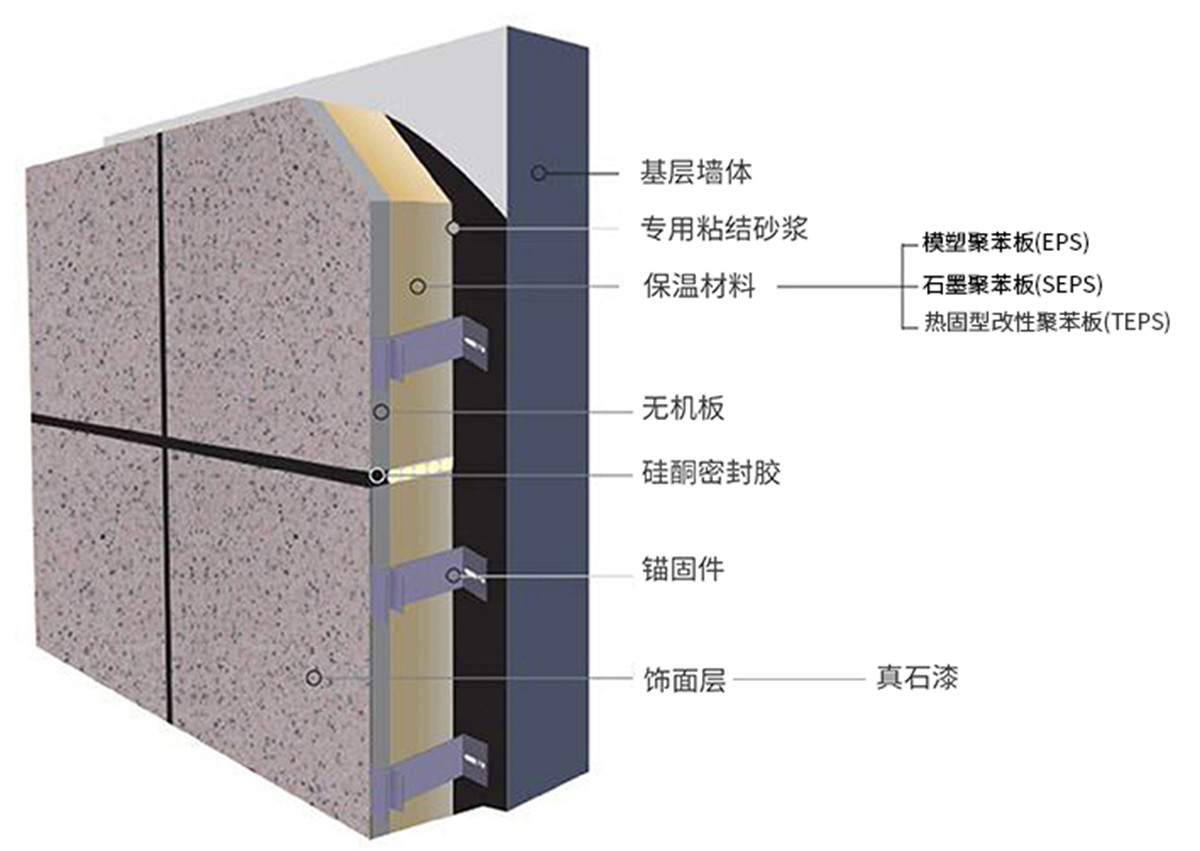 真石漆保溫裝飾一體板選用高密度、高強度A1級無機板為基材,通過精砂、滲透封閉、界面處理、飾面噴涂(輥涂)、固化、養(yǎng)護、復(fù)合等多道現(xiàn)代化生產(chǎn)工序加工成型。真石漆飾面表面層厚實,具有真實的自然色澤、質(zhì)感,給人以高雅、和諧、莊重之美感。