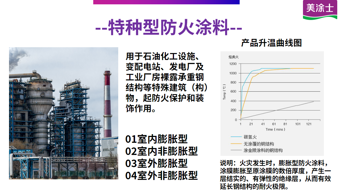 由丙烯酸樹脂,三聚氰胺、季戊四醇、聚磷酸銨、溶劑、助劑等組成,遇火災時能膨脹增厚炭化,形成不易燃燒的海綿狀炭質層,提高鋼結構的耐火時間,有效保護鋼結構建筑免受火災侵害。